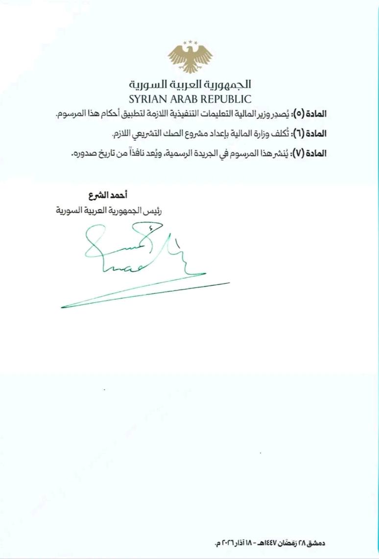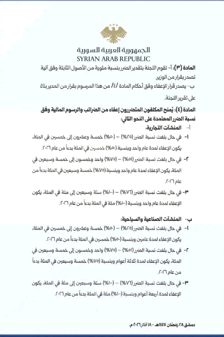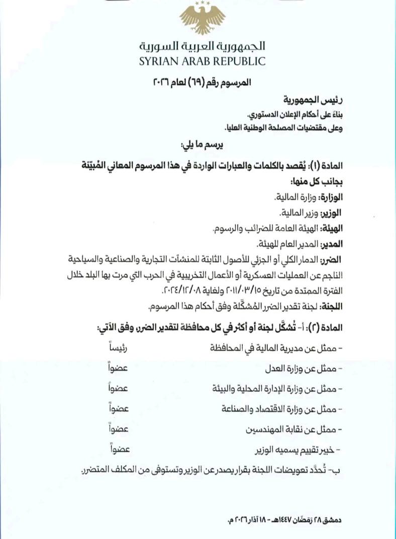 السيد الرئيس أحمد الشرع يصدر المرسوم رقم (69) لعام 2026، القاضي بتشكيل لجان تقدير الضرر ومنح إعفاءات من الضرائب والرسوم للمنشآت الصناعية والتجارية والسياحية وفق نسب الضرر المعتمدة.