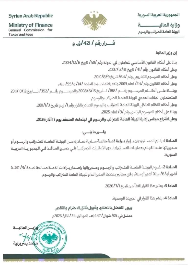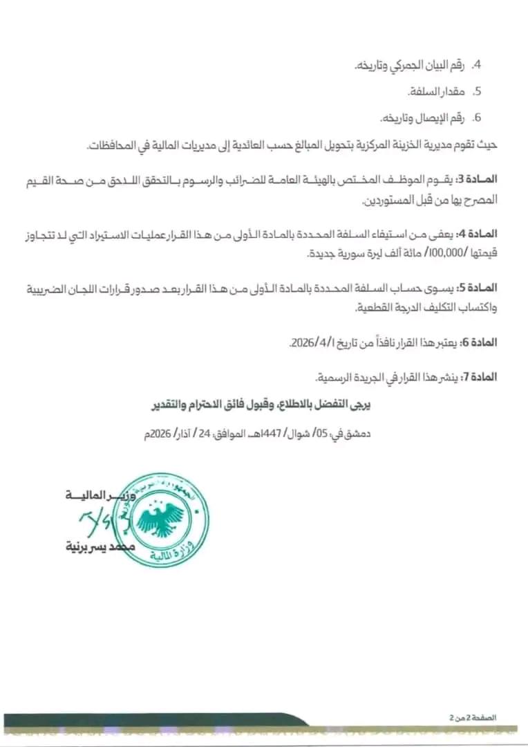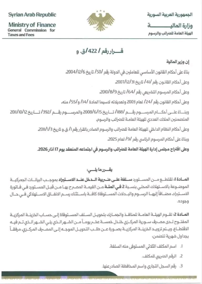 " استجابةً لتوصيات غرف الصناعة والتجارة وحرصاً على الحد من ظاهرة المستورد الوهمي، ومكافحة التهرب الضريبي، وبالتنسيق مع الهيئة العامة للمنافذ والجمارك، أصدرنا اليوم قرار يستوجب من خلاله استيفاء سلفة ضريبية من المستوردين، بقيمة 2 في المئة من قيمة الفاتورة."
